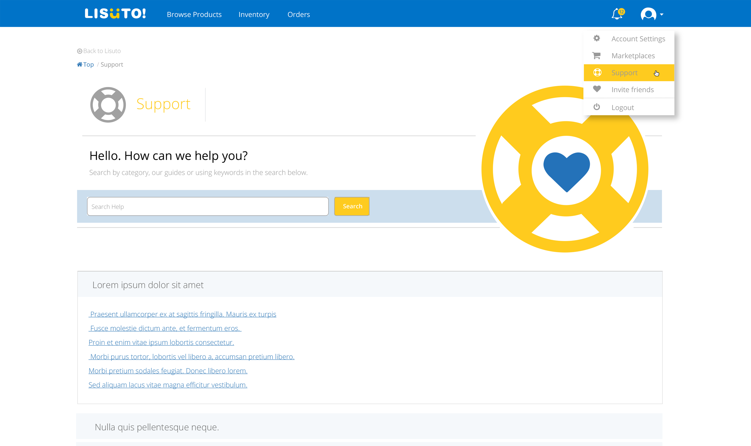 I used icons—a lifebuoy for support and a heart for customer care—to create an appealing design. A search feature at the top would allow users to find FAQs quickly.