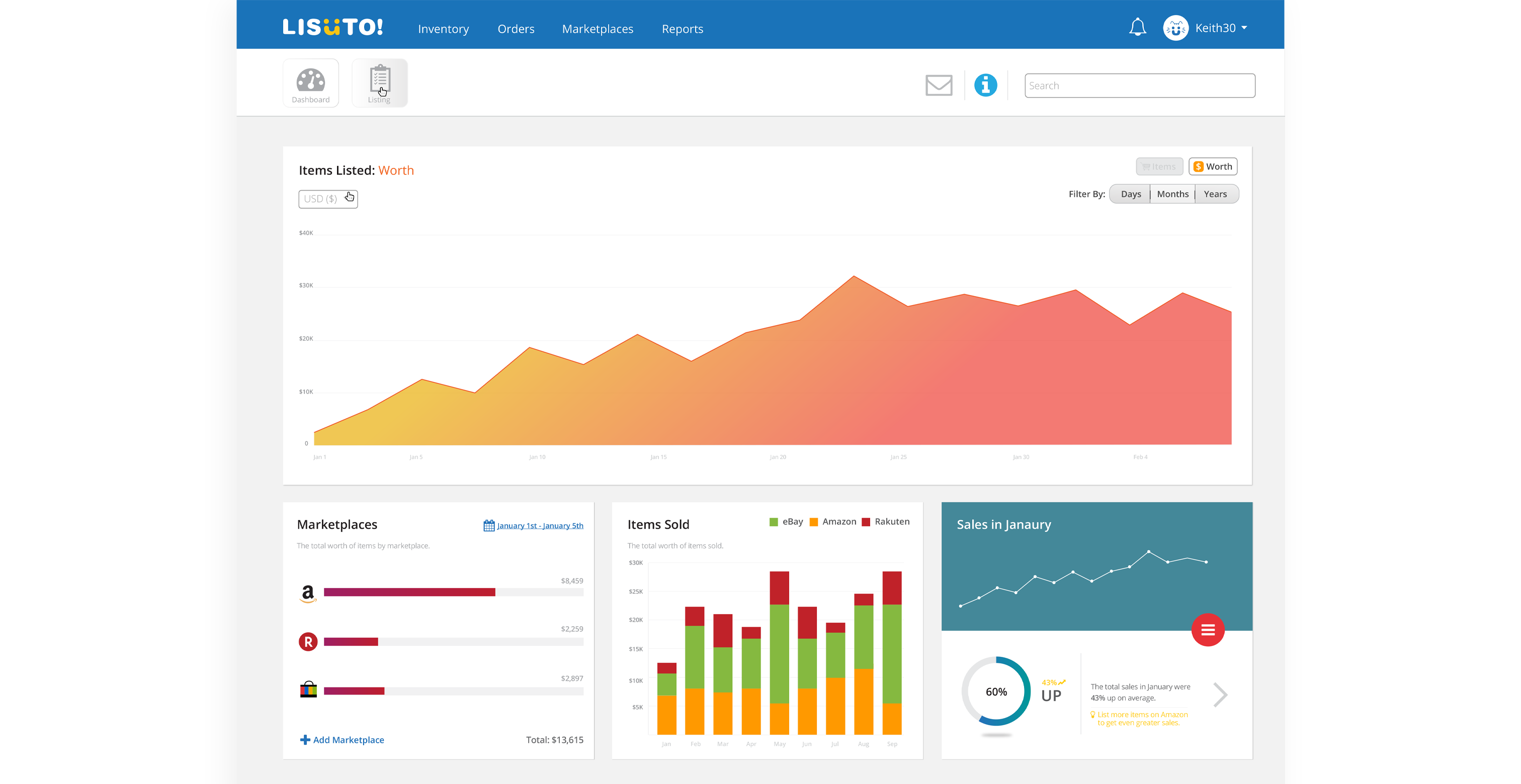 To improve UX for viewing sales, inventory stats, and listing items, we wanted to create a customisable dashboard with moveable widgets.