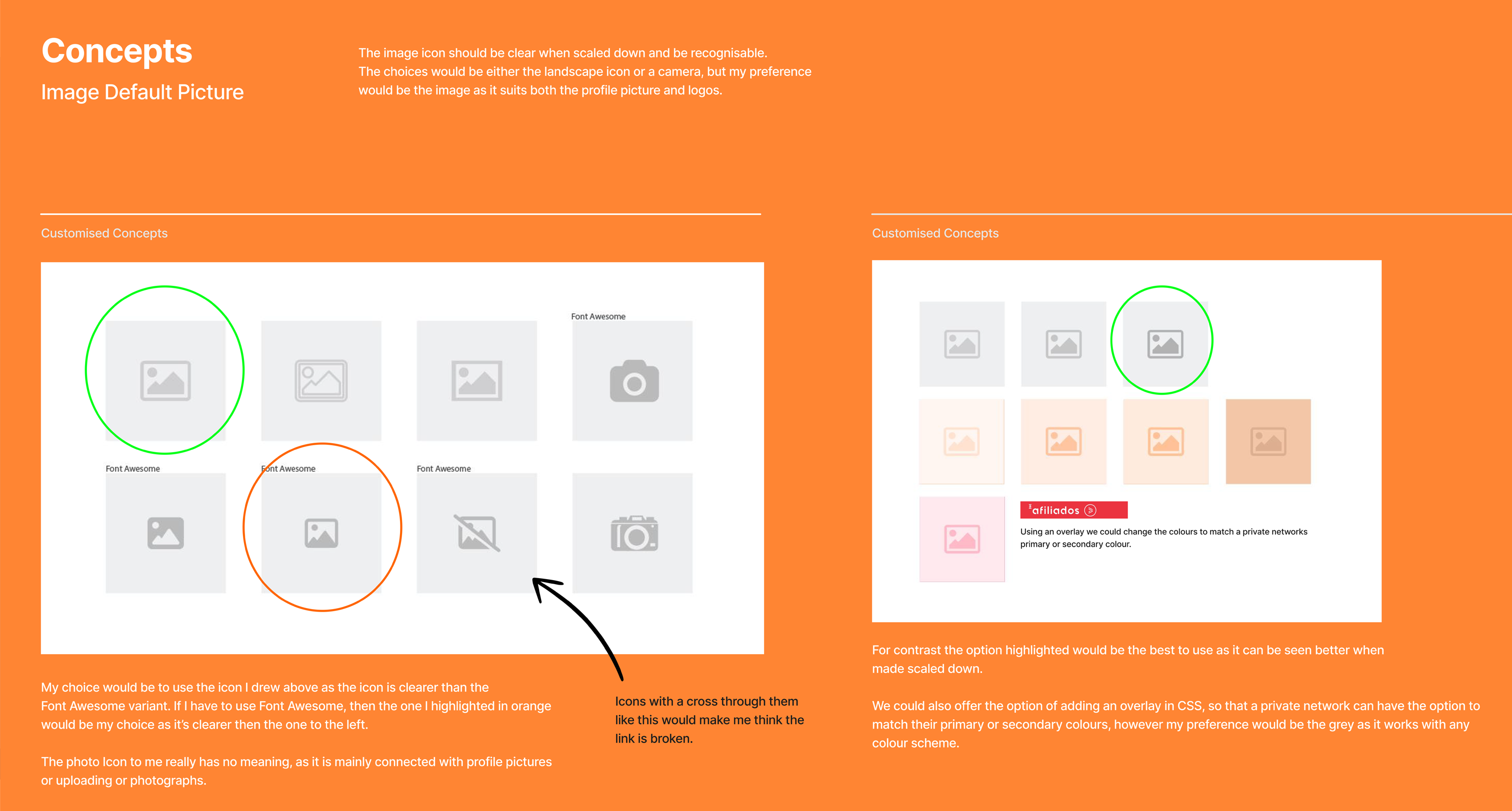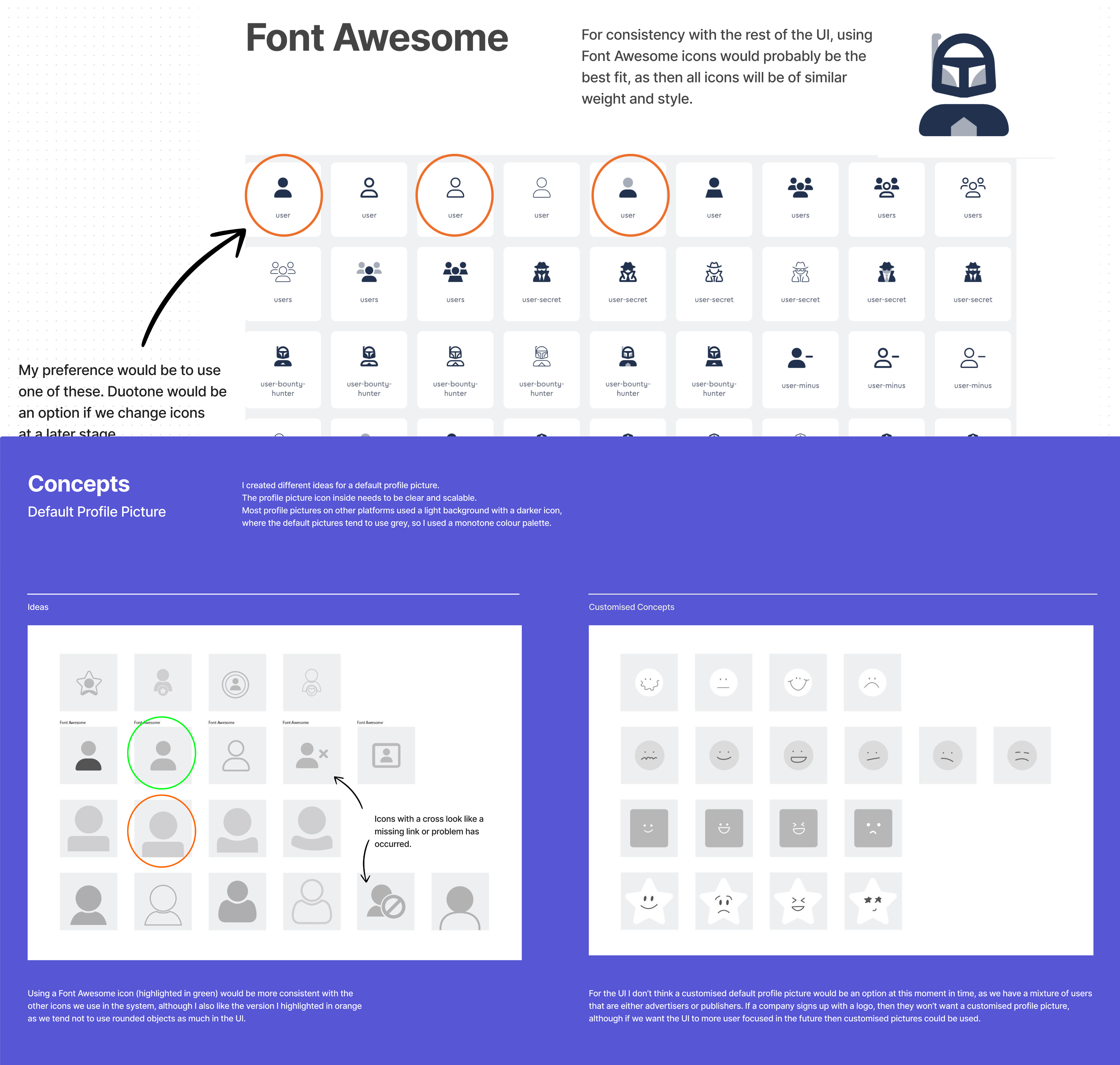 Since Font Awesome was our resource for icons, it made sense to me to use it as a base for the default profile picture design. I created various ideas that used the icon library and discussed my ideas with the rest of the UX team to select the most suitable icons and determine the format for the default profile picture.