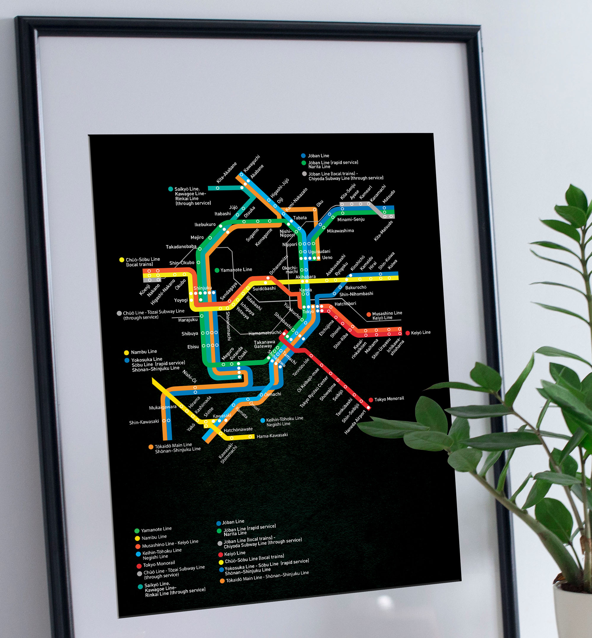 Tokyo is among the world’s busiest cities, with millions using its extensive network of overground and underground train lines daily. This inspired me to create an illustration showcasing a map of some of the train lines and stations.
