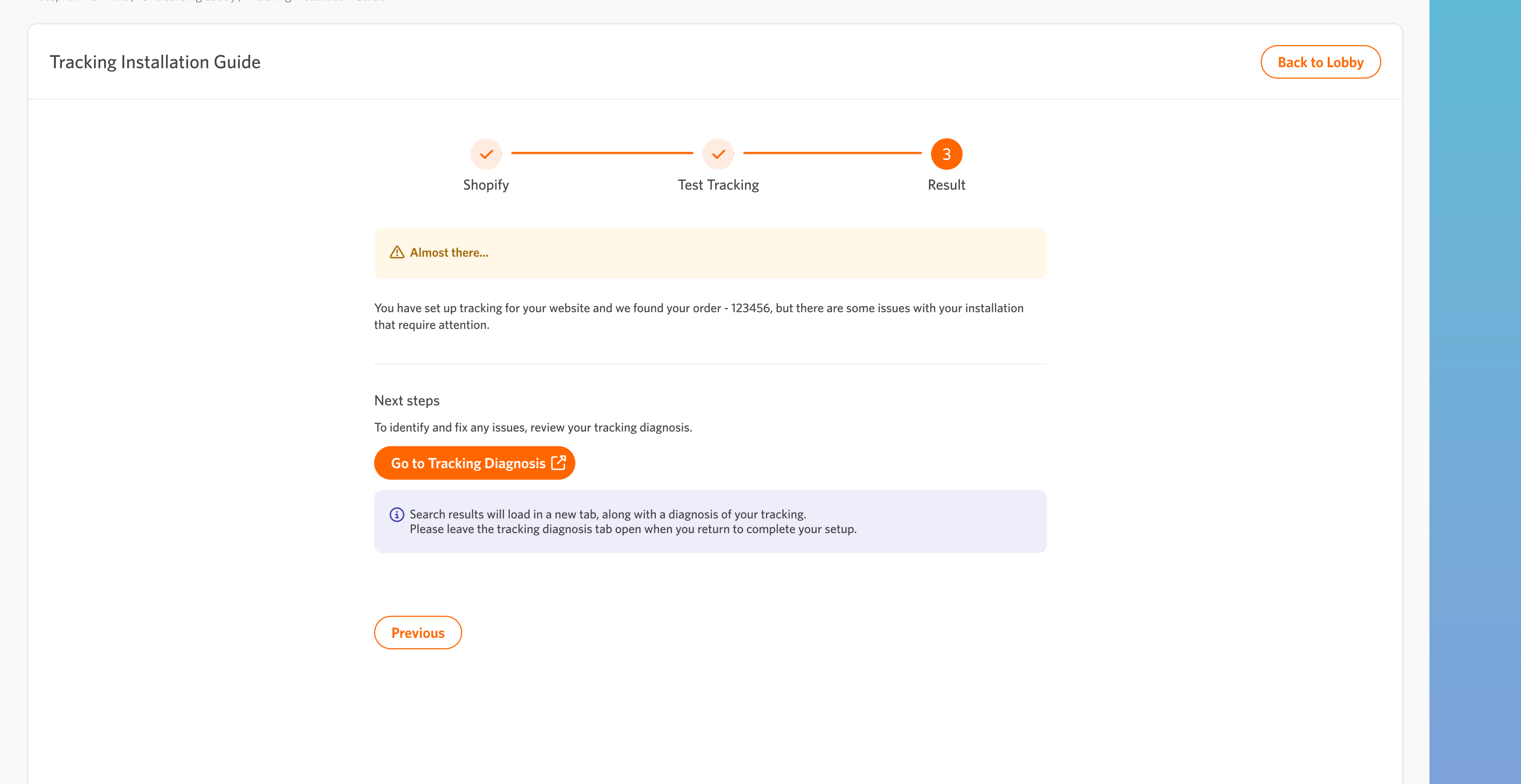 We enhanced the tracking installation guide by making it easier to integrate the tracking code and conduct test orders. Upon completion, customers are directed to a page that displays the test results.